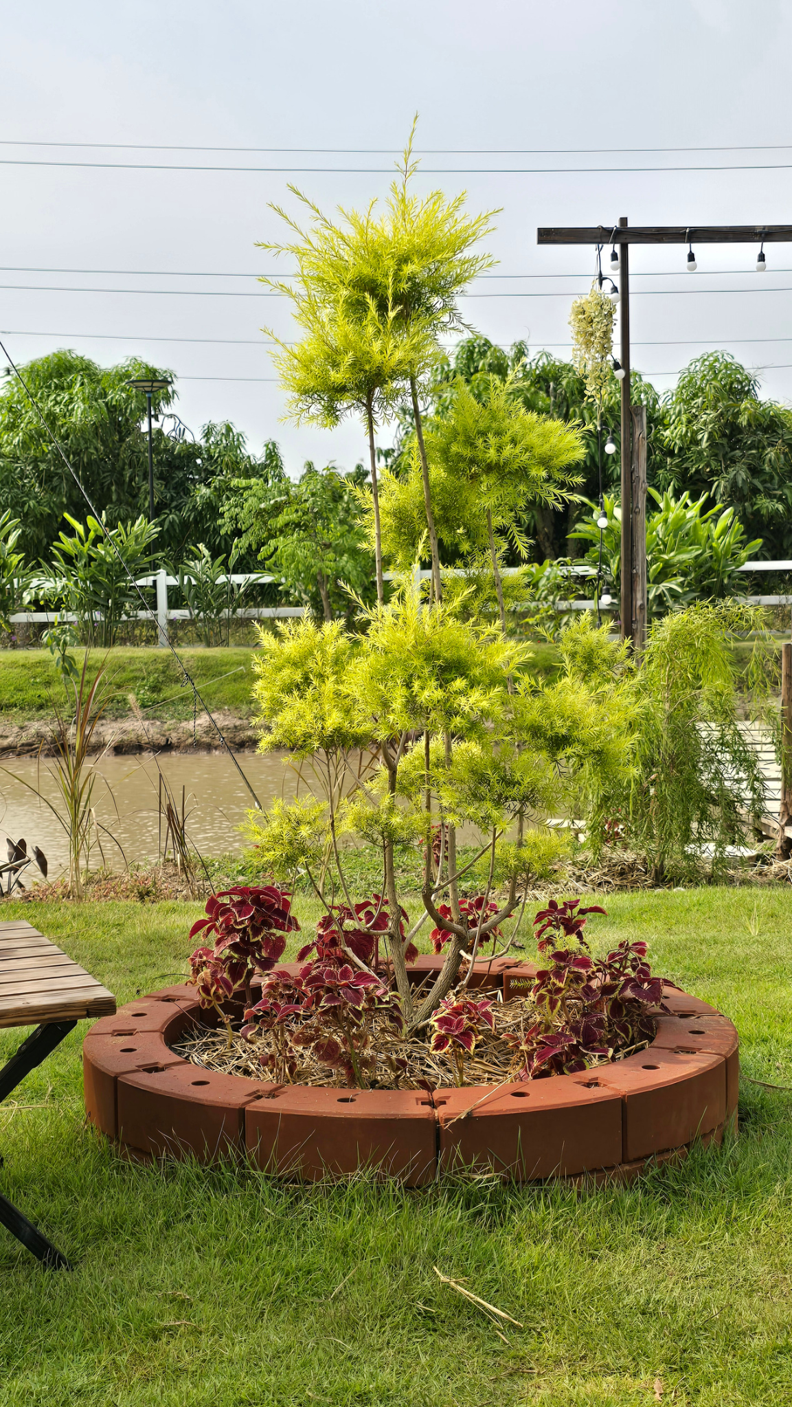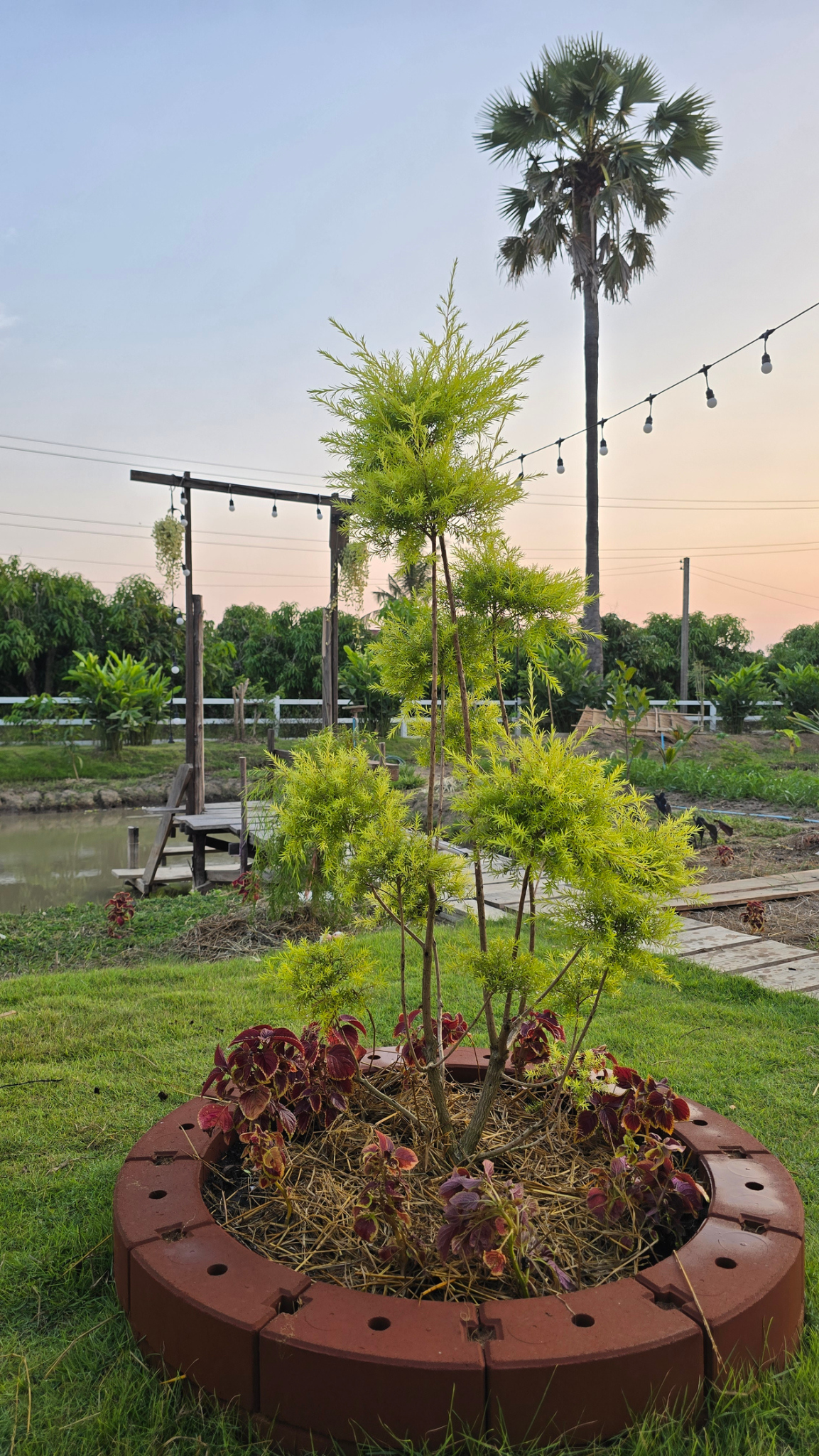 หากคุณกำลังมองหาไอเดียแต่งสวนที่ต้องการทั้งความร่มรื่นและสีสันที่ดูนุ่มนวลสบายตา การเลือกปลูก "หลิวทองพุ่ม" คือหนึ่งในคำตอบที่น่าสนใจที่สุดครับ ในสวนปันสุขของเรา เราได้นำต้นหลิวทองพุ่มฟอร์มสวยมาจัดวางเป็นจุดนำสายตาที่สมบูรณ์แบบท่ามกลางบรรยากาศริมน้ำที่ผ่อนคลาย ความลับของ "ทรงพุ่มสีทอง" หลิวทองพุ่ม มีชื่อวิทยาศาสตร์ว่า Melaleuca bracteata F. Muell. โดยในงานจัดสวนยุคใหม่นิยมใช้ชื่อพันธุ์ปลูกที่เน้นสีสันอย่าง 'Revolution Gold' หรือ 'Revolution Green' แล้วแต่ความชอบด้านสีสัน จุดเด่นเชิงพฤกษศาสตร์ของพืชชนิดนี้คือลักษณะใบที่มีขนาดเล็ก รูปเข็ม เรียงสลับหนาแน่นเต็มกิ่งก้าน ทำให้เมื่อเติบโตจะมีรูป "ทรงพุ่มสีทอง" ที่แน่นและดูละเอียดนุ่มนวล โดยเฉพาะเมื่อได้รับแสงแดดจัดเต็มวันอย่างที่เห็นในภาพ สีเหลืองทองของใบจะยิ่งทอประกายและสว่างชัดเจนที่สุด ตัดกับสีเขียวเข้มของหญ้าและต้นไม้อื่นๆ รอบข้างได้อย่างลงตัว จากภาพ คุณจะเห็นการจัดองค์ประกอบที่โดดเด่น: