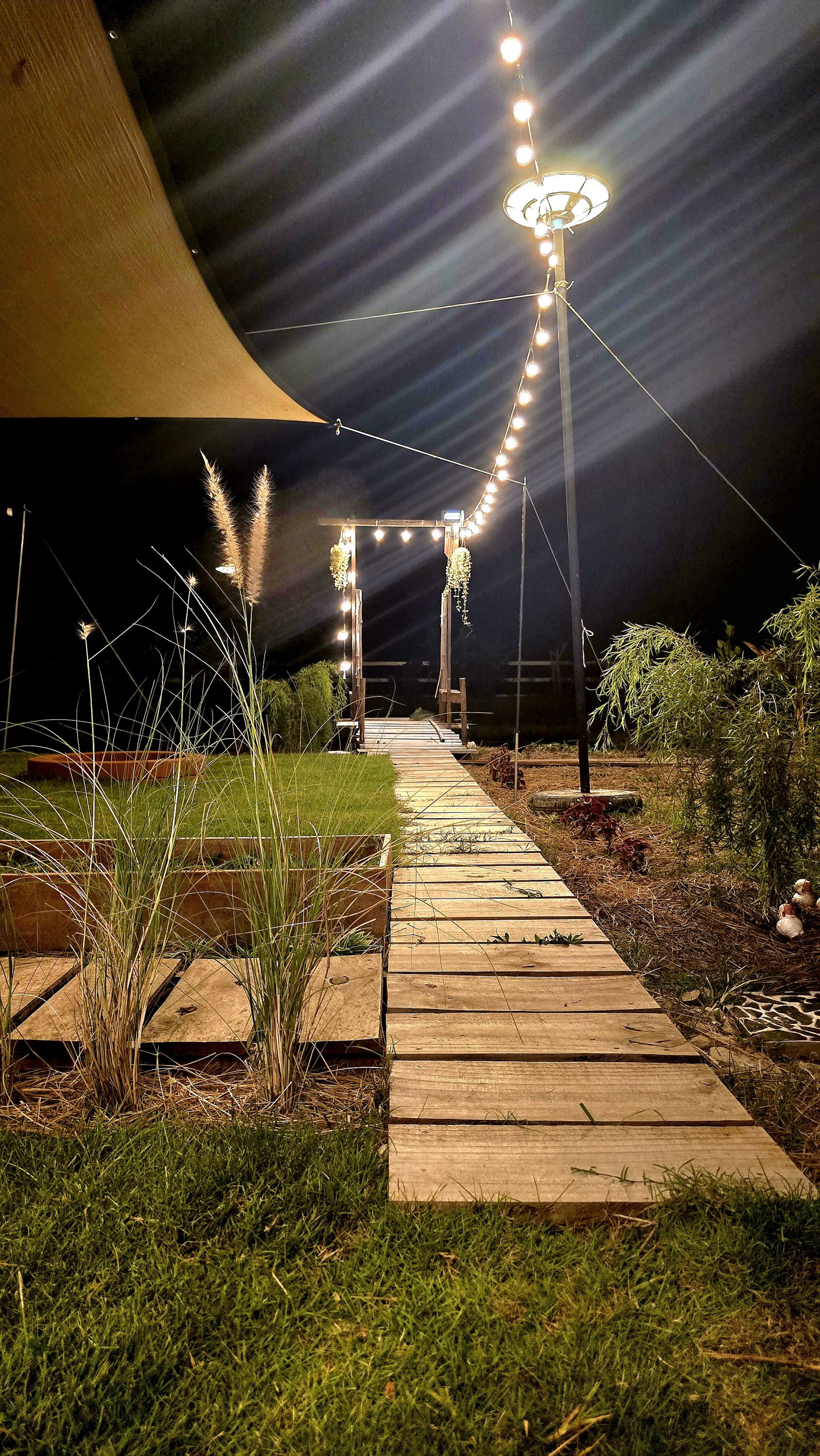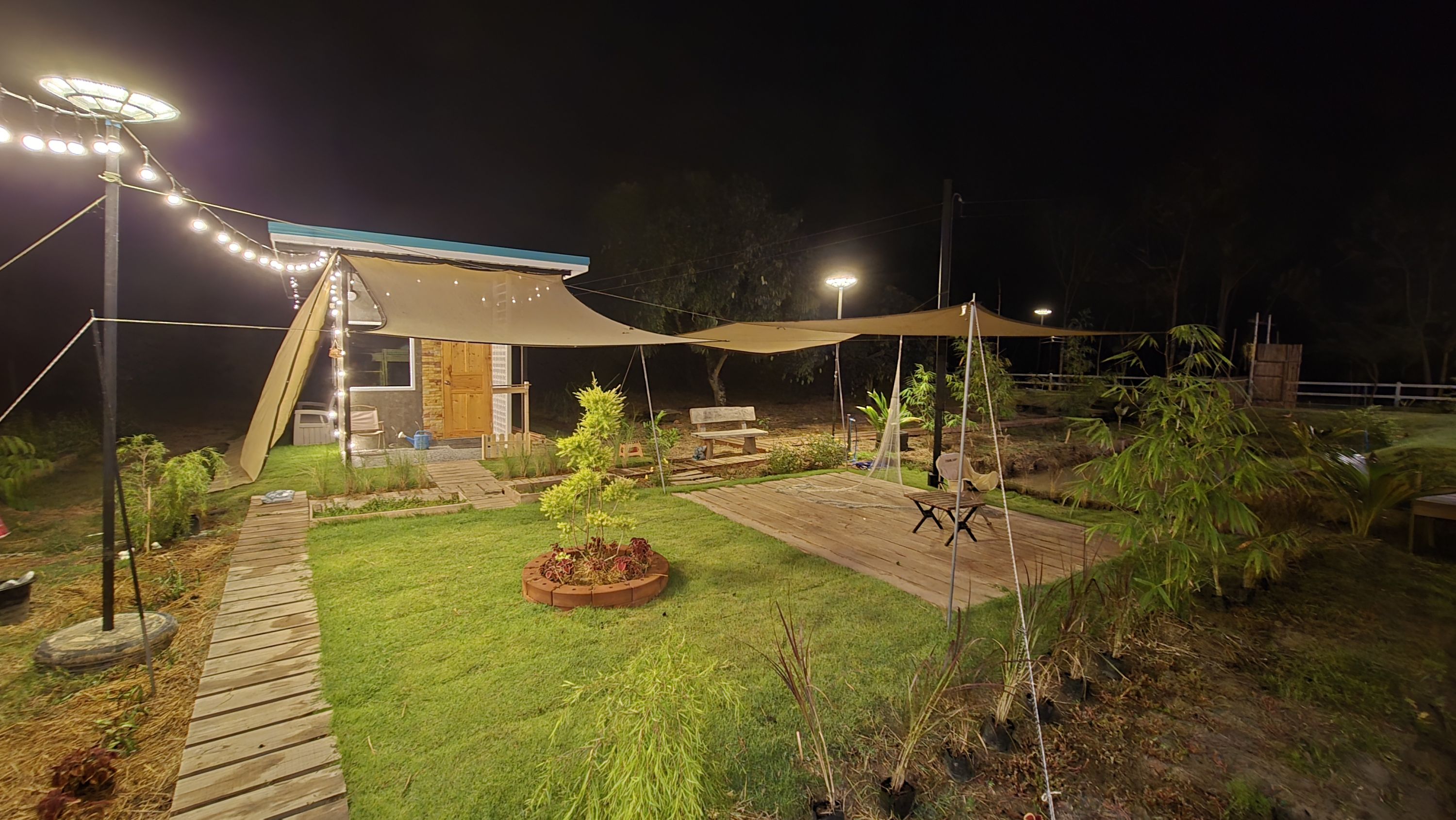มุมนั่งเล่นหน้าบ้านจิ๋วกลางสวนที่สวนปันสุขสุโขทัยความสุขที่ออกแบบได้...ในมุมนั่งเล่นหน้าบ้านจิ๋วกลางสวน ที่ "สวนปันสุข"เมื่อแสงตะวันลับขอบฟ้าที่เมืองสุโขทัย และความมืดเริ่มปกคลุมสวนของเรา สิ่งที่ปรากฏขึ้นมาแทนที่คือความเงียบสงบที่มีเสียงจิ้งหรีดบรรเลงเป็นเพลงประกอบเบาๆ ครับ วันนี้ผมอยากพาทุกคนมาดู "มุมรับแขกกลางแจ้ง" หน้าบ้านจิ๋วของเรา ซึ่งเป็นมุมโปรดที่ผมมักจะมานั่งพักแข้งพักขาหลังจากลุยงานสวนมาทั้งวัน ในภาพนี้อาจจะดูเรียบง่าย ไม่ได้หรูหราอะไรมากครับ มีเพียงเก้าอี้สนามสองตัวกับโต๊ะไม้ที่เราต่อขึ้นมาเอง (DIY) แบบง่ายๆ แต่นี่แหละครับคือเสน่ห์ของชีวิตเกษตรกรยุคใหม่ที่พยายามพึ่งพาตัวเองให้มากที่สุด สัมผัสแห่งค่ำคืนที่สวนปันสุข: