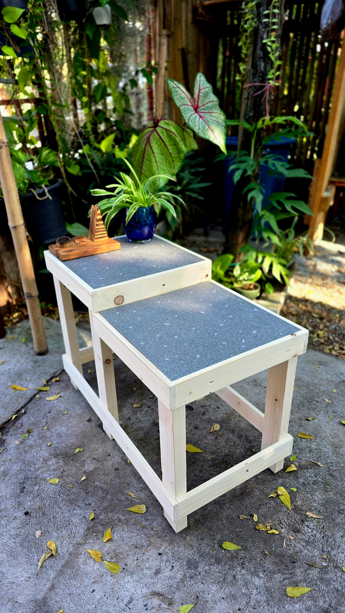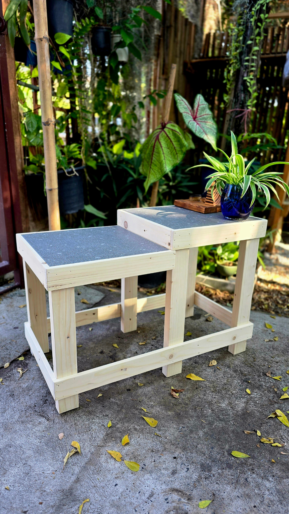 โต๊ะชุดนี้เกิดขึ้นจากโจทย์ที่ว่า เราจะทำอย่างไรให้โต๊ะไม้ใช้งานในที่ชื้นหรือวางกระถางต้นไม้ได้โดยไม้ไม่เปื่อยพุพอง? คำตอบจึงมาจบลงที่การผสมผสานวัสดุสองชนิดเข้าด้วยกัน: